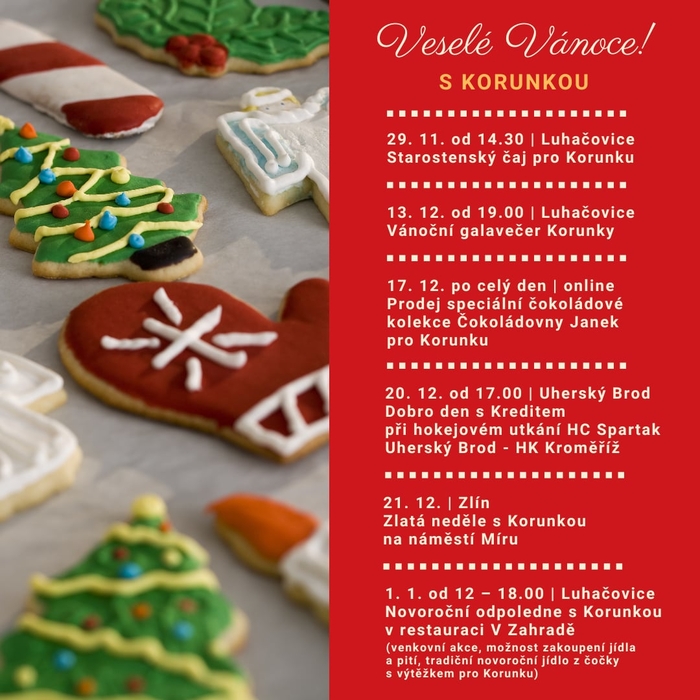 První zastávkou bude Vánoční jarmark a rozsvícení vánočního stromu v Luhačovicích, kde v sobotu 29. listopadu nebude chybět ani stánek KORUNKY. Najdete ho hned vedle místa, kde bude starosta tradičně rozlévat starostenský čaj.